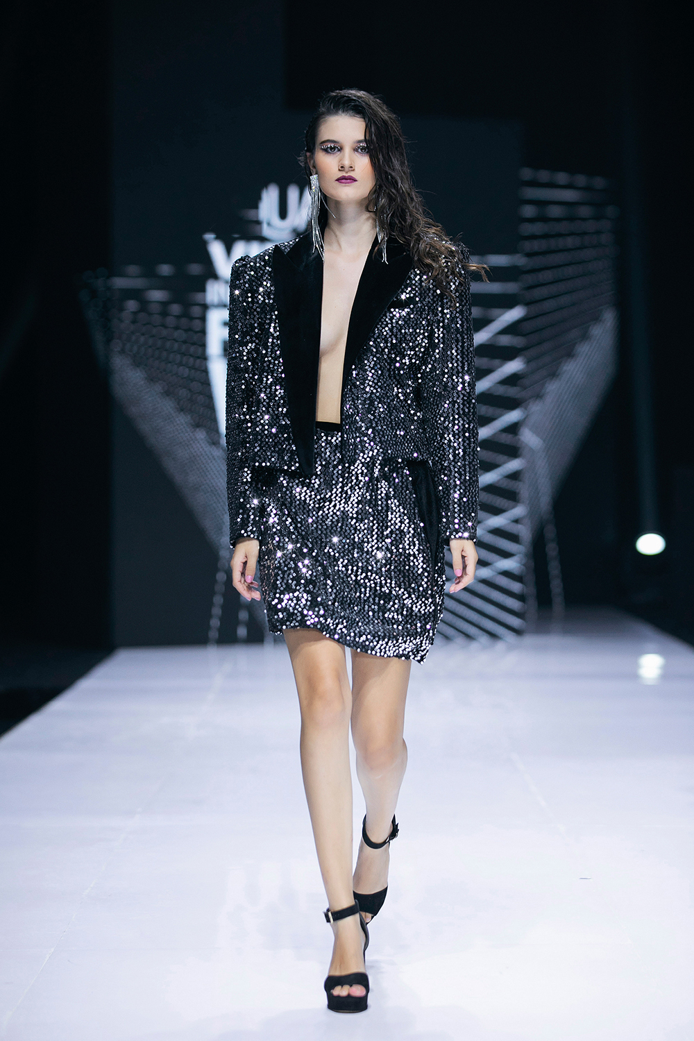 Trên bảng màu đen và trắng kinh điển, Devon Nguyễn khai thác chất liệu sequin, tweed, satin... Nếu phần đầu, show đem tới những mẫu áo khoác cơ bản, nửa sau của bộ sưu tập là sân chơi của những thiết kế phá cách, phô trương đường cắt, cấu trúc, phù hợp với những buổi tiệc.
