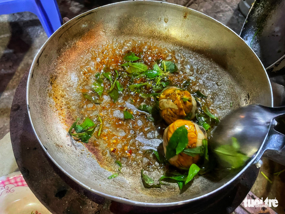 Hột vịt lộn sau khi luộc được bóc vỏ và cho vào chảo xào cùng sốt me - Ảnh: HOÀNG AN