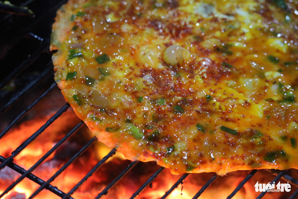 'Trên một chiếc bánh tráng được đặt trên bếp than nóng, người ta phết lên hỗn hợp gồm hành phi, hành lá xắt nhỏ, một quả trứng và một ít tương ớt' - Ảnh: HOÀNG AN