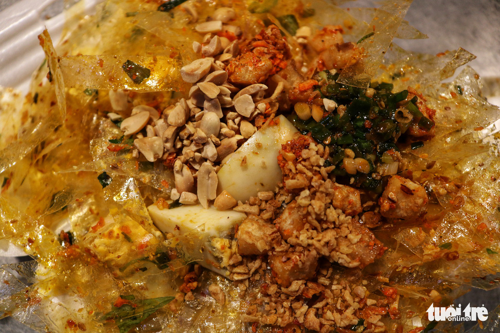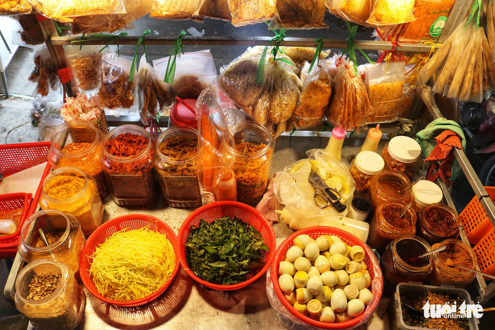 'Nào là bánh tráng, ruốc khô, sa tế, hành phi, hành lá, trứng cút, khô bò, đậu phộng, muối tôm, nước tắc…' - Ảnh: HOÀNG AN