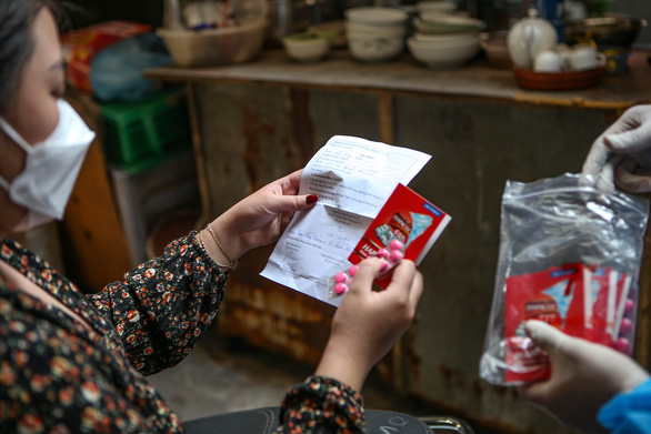 Cán bộ y tế phường Ô Chợ Dừa cấp phát túi thuốc A cho bệnh nhân COVID-19 điều trị tại nhà - Ảnh: HÀ QUÂN