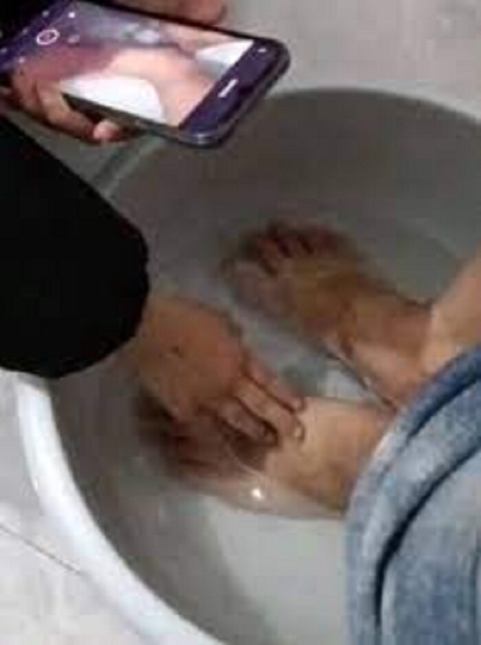 Trong khi đó, con gái của ông đang cầm quay lại cảnh này. Cô bé cúi xuống, hướng camera về phía chậu nước ngâm chân của bố rồi cúi xuống rửa chân cho bố.