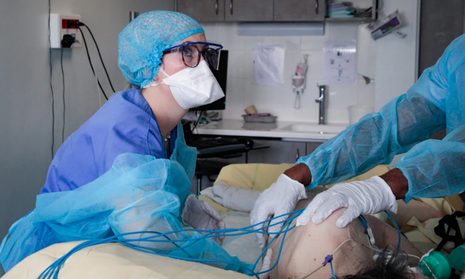 Nhân viên y tế Pháp chăm sóc một bệnh nhân trong phòng hồi sức tích cực ở bệnh viện tại Clamart, ngoại ô Paris ngày 23/12. Ảnh: AFP.