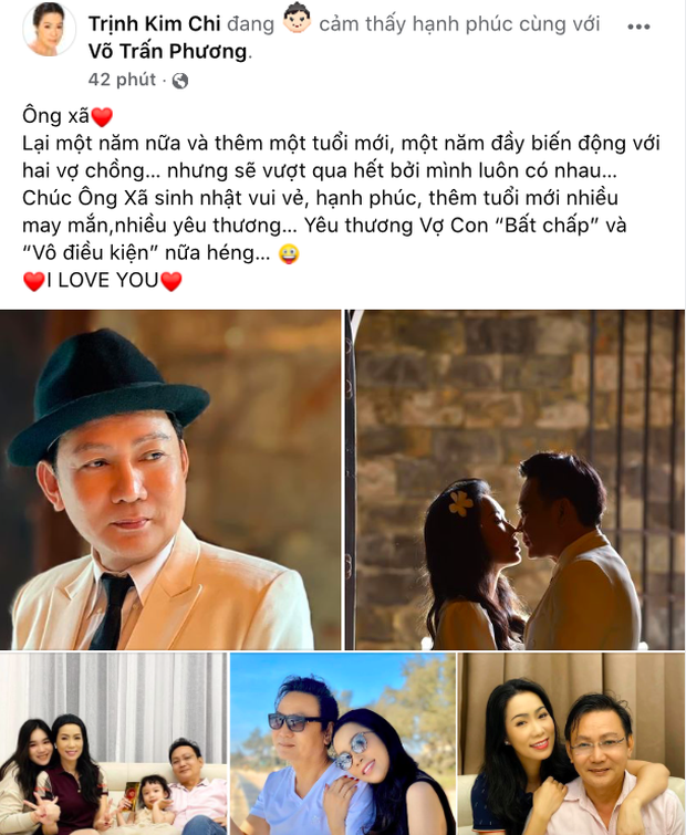 Cụ thể, nữ diễn viên "xả kho" loạt ảnh bên gia đình để chúc mừng sinh nhật chồng. Giữa lúc đang "ngập" trong drama, Trịnh Kim Chi ngọt ngào nhắn nhủ chồng: "Một năm đầy biến động với hai vợ chồng nhưng sẽ vượt qua hết bởi mình luôn có nhau". Kể từ sau khi lên tiếng, Trịnh Kim Chi không có bất kì lời đôi co hay đáp trả nào với NS Thương Tín.