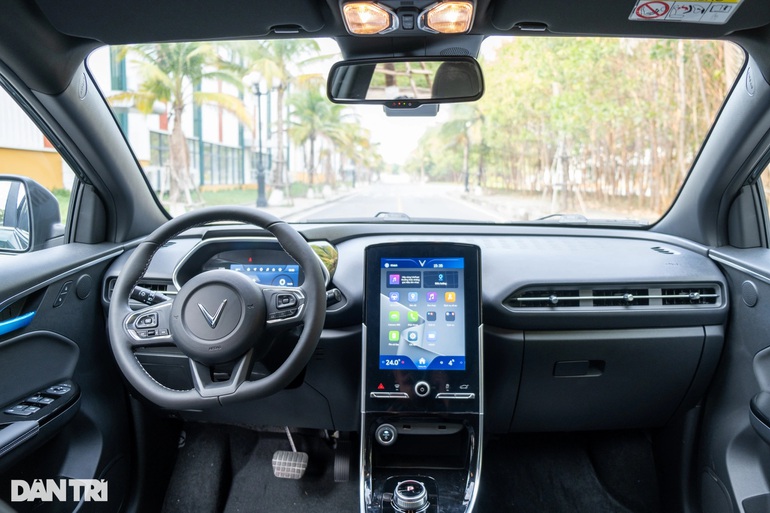 Nội thất VF e34 kết hợp nhựa và da, không khác nhiều so với các xe cùng tầm tiền. Điểm nhấn là vô-lăng vát đáy, màn hình LCD hiển thị thông tin đặt phía sau tay lái. Màn hình giải trí đặt dọc, phản hồi nhanh hơn so với trên dòng Lux. Trợ lý giọng nói Vivi nhận lệnh tốt ngay cả khi không phát âm chuẩn. Cốp khá rộng nhưng không có lốp dự phòng đi kèm.