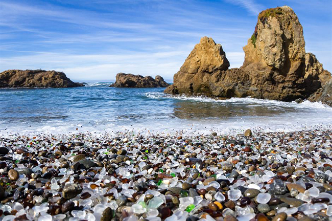 Bãi biển pha lê, California: Bờ biển California là những bãi biển cát vàng, nhưng ở đây còn có bãi biển pha lê được tìm thấy bên cạnh công viên bang MacKerricher. Những viên pha lê này chính là thủy tinh vỡ cùng các loại rác khác được làm nhẵn và tròn bởi các làn sóng biển và tích tụ lại trên bờ.