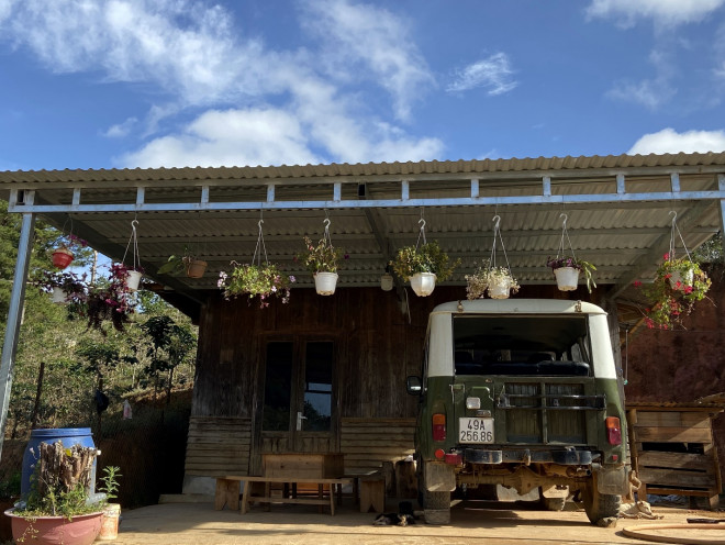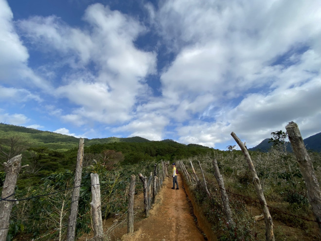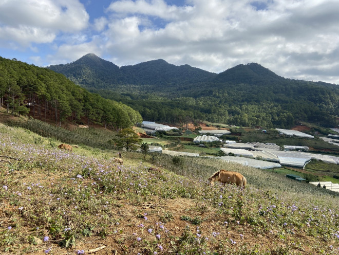 Đoạn đường đầu tiên khá thú vị khi đi ngang qua những khu vườn trồng café, chăn thả gia súc của người dân. Xa xa là những khu vườn nhà lồng trồng rau, hoa, dâu tây lấp lóa dưới ánh nắng mặt trời.