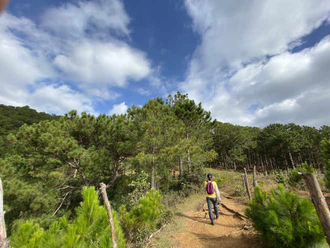 Con đường mòn bắt đầu nhỏ dần khi bắt đầu tiến vào rừng thông. Đó cũng là chặng thú vị nhất của hành trình khi bạn được “tắm” giữa một rừng thông xanh rì rào mát lạnh. Con đường mòn ngày đầu tuần hầu như không có bóng dáng các du khách. Thỉnh thoảng chúng tôi gặp vài bạn trẻ, vài vị khách nước ngoài lớn tuổi đi rất hăng hái. Bạn tôi bảo khó mà tìm thấy người Việt Nam tầm tuổi trên 60 đi leo núi. Mà biết đâu sau này chúng tôi ở độ tuổi đó cũng chẳng còn đủ sức mà leo nữa, nên tranh thủ lúc còn trẻ khỏe sẽ trải nghiệm thật nhiều.