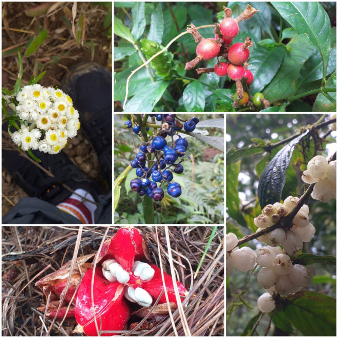 Dù vậy, tôi cũng không quên ngắm nhìn những loài hoa trái dọc đường. Vài cây phong đang trút lá vàng nổi bật giữa những tán rừng xanh. Vài loại quả đủ loại xanh đỏ tím vàng màu sắc bắt mắt, bạn tôi cảnh báo ngay rằng chỉ chụp hình thôi đừng dại dột đụng vào hay ăn thử, ngửi thử. Ngay cả tên gọi của chúng bọn tôi còn không biết, đương nhiên không dám mạo hiểm rồi. Chúng tôi còn trầm trồ không ngớt với những cây gỗ to phủ đầy rêu xanh, sừng sững vươn cao ngạo nghễ.