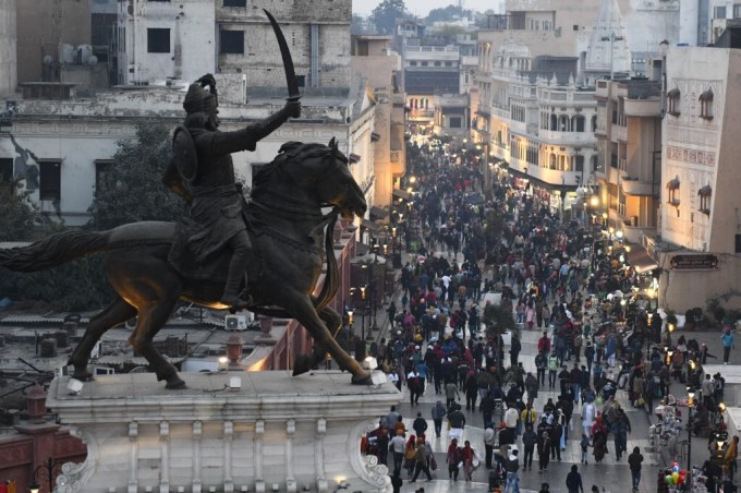 Du khách đi dọc phố Di sản gần tượng Maharaja Ranjit Singh ở Amritsar, Ấn Độ ngày 31/12/2021. Ảnh: AFP.