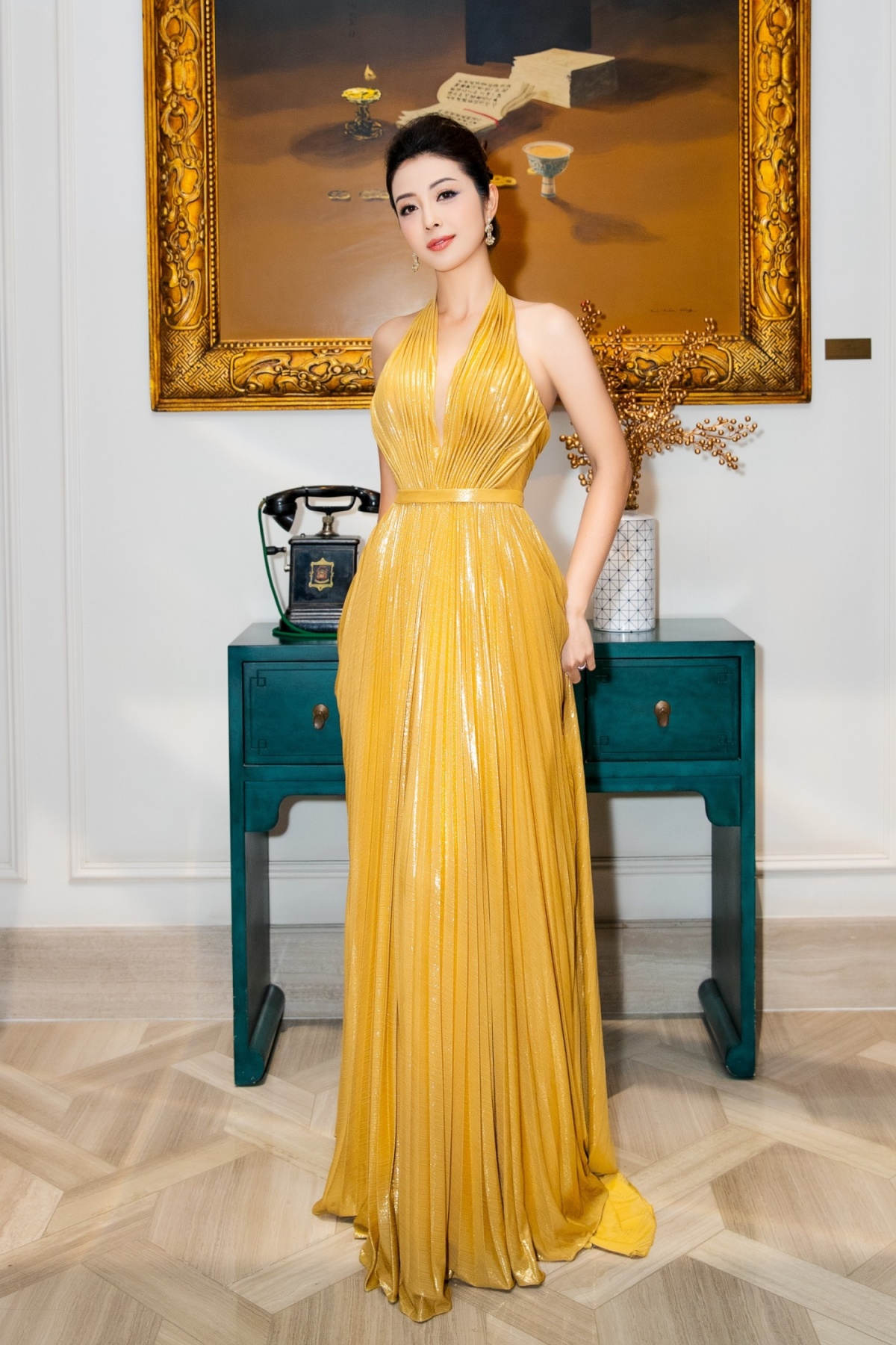 Cũng trong đêm tiệc, Jennifer thay đầm vàng xếp ly, xẻ ngực sâu của Brian Võ, phối khuyên tai Chanel. Người đẹp cho biết nhờ giảm ba kg, cô mới tự tin diện các thiết kế gợi cảm. Ảnh: Minh Luân