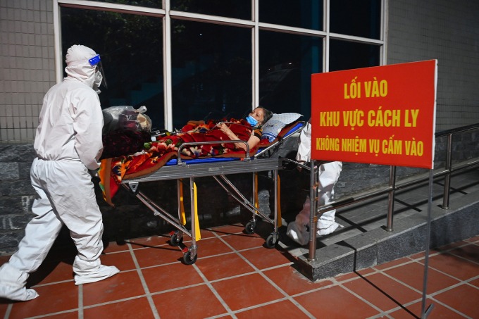 Nhân viên y tế Trung tâm cấp cứu 115 Hà Nội chuyển bệnh nhân F0 đến nơi điều trị. Ảnh: Giang Huy