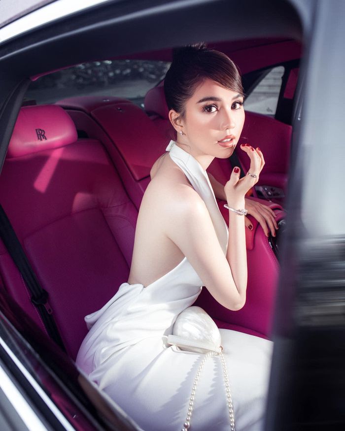 Ngọc Trinh đẹp kiêu sa, không kém phần sexy với mẫu váy xếp tầng, để lộ lưng trần và lấp ló vòng 1.