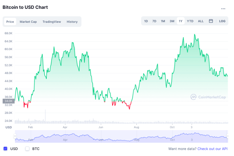 Giá Bitcoin biến động mạnh trong năm ngoái. Tuy nhiên, đồng tiền vẫn tăng giá gần 46% so với đầu năm 2021. Ảnh: CoinMarketCap.