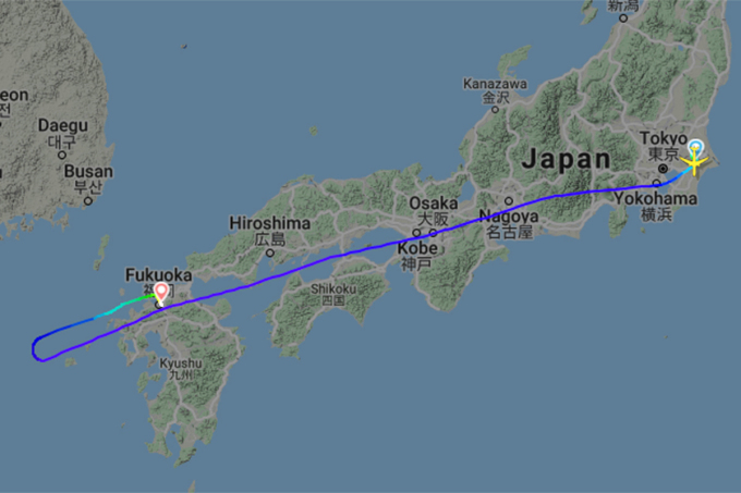 Ảnh vệ tinh cho thấy máy bay phải quay đầu hạ cánh tại sân bay Fukuoka. Ảnh: flightradar
