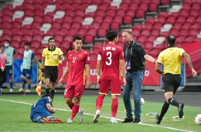 Trong trận lượt đi bán kết AFF Cup 2020, HLV Thái Lan và Quế Ngọc Hải đã xảy ra tranh cãi khi đội trưởng tuyển Việt Nam đá bóng vào cầu thủ đội bạn.
