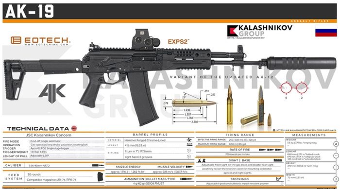 Nga đã ký những hợp đồng xuất khẩu đầu tiên cho súng trường tấn công AK-19 thế hệ mới, được điều chỉnh đặc biệt để sử dụng các loại đạn của NATO. Điều này tuyên bố bởi thư ký báo chí của Cơ quan Hợp tác Kỹ thuật - Quân sự Liên bang Nga (FSMTC) - bà Valeria Reshetnikova.