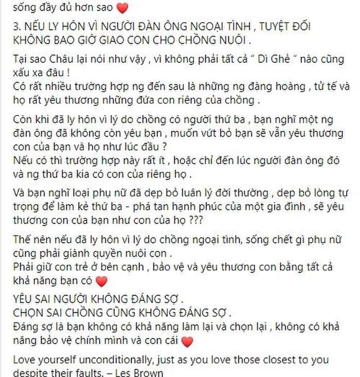 Khi đọc những thông tin sự ra đi của bé gái 8 tuổi bị dì ghẻ bạo hành, Lý Phương Châu không kìm được nước mắt, buộc phải lên tiếng: "Yêu sai người không đáng sợ, chọn sai chồng cũng không đáng sợ. Đáng sợ là bạn không có khả năng làm lại và chọn lại, không có khả năng bảo vệ chính mình và con cái. Tất cả lời hứa , niềm tin của tình yêu và hôn nhau sẽ không còn giá trị gì nữa vào thời điểm đó”.