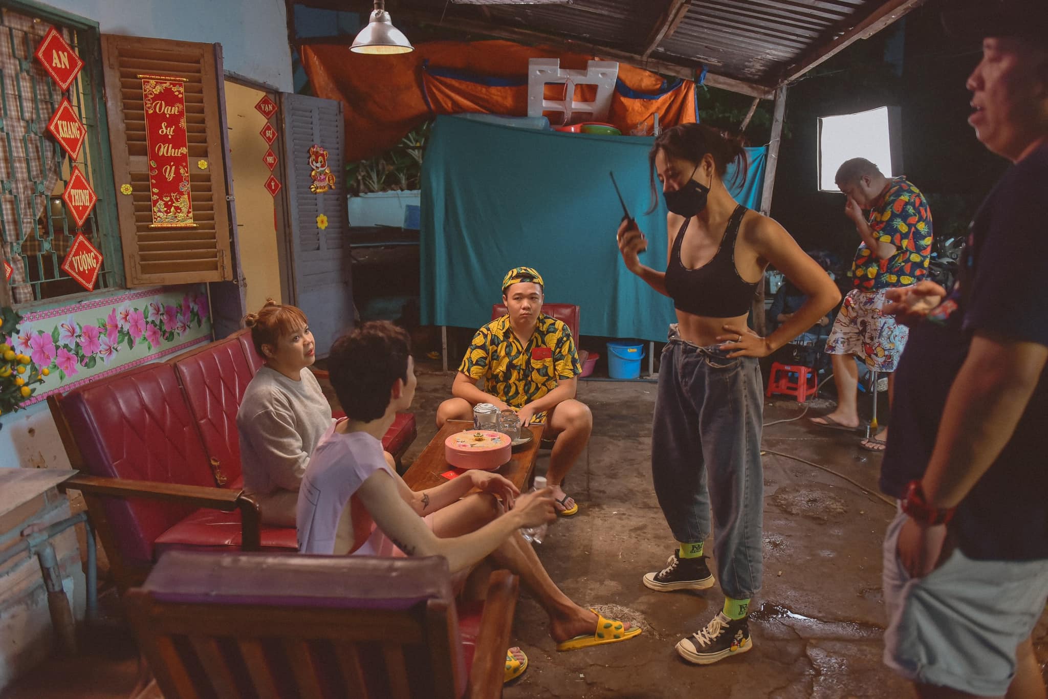 Nam Thư (áo đen) chỉ đạo diễn xuất trong tác phẩm Tết sắp ra mắt