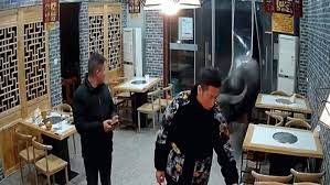 Vụ việc xảy ra tại thành phố Thái Châu, tỉnh Giang Tô, miền đông Trung Quốc. Trong video, 2 người đàn ông đứng nói chuyện - một người vẫn dùng điện thoại, còn người kia uống nước - bên trong một nhà hàng. Vài giây sau, một con trâu bất ngờ xuất hiện, húc thẳng vào người đàn ông vừa uống nước.