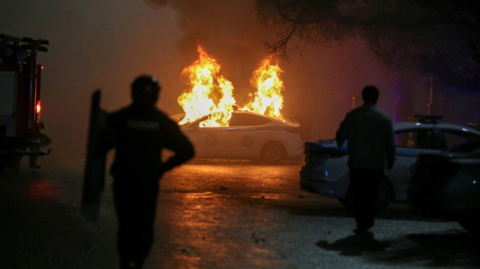 Một xe cảnh sát bị người biểu tình đốt cháy ở Almaty hôm 5/1. Ảnh: Reuters.
