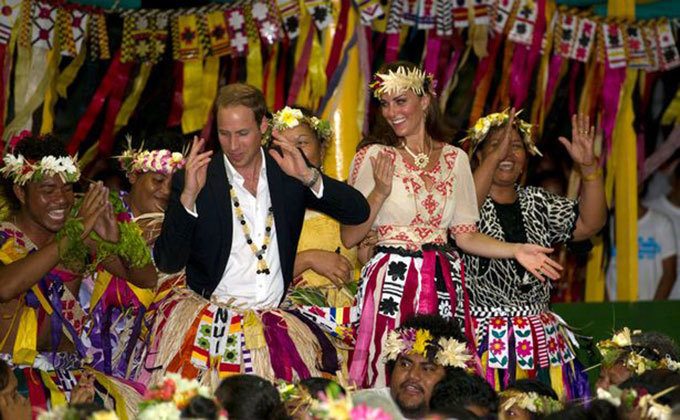Kate nhảy múa với William ở đảo Solomon năm 2012 - một trong những lần hiếm hoi cô nhảy nơi đông người. Ảnh: PA