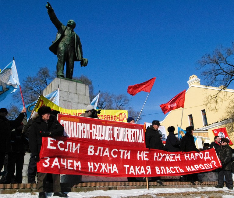 Hình minh hoạ: những đảng viên cộng sản Nga cầm biểu ngữ ca ngợi chủ nghĩa xãhooij ở Vladivostok hôm 31/1/2009. AFP