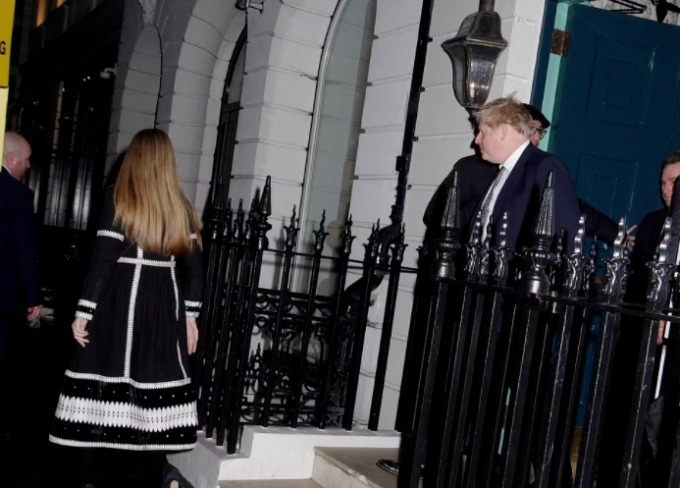 Thủ tướng Boris và phu nhân Carrie được nhìn thấy bước ra khỏi câu lạc bộ Oswald's ở khu thượng lưu Mayfair, London khoảng 21h30 ngày 6/1. Bà Carrie, 33 tuổi, mặc một chiếc váy midi màu đen, viền trắng của thương hiệu Wiggy Kit có giá 695 bảng Anh (944 USD), đeo chiếc túi chéo vai đính cườm Anya Hindmarch giá 413 bảng Anh (561 USD). Trong khi đó Thủ tướng Boris, 57 tuổi, mặc bộ vest màu xanh đen quen thuộc. Bà Carrie đi trước chồng vài bước, theo sau họ là đội an ninh gồm sáu người. Cả hai được hộ tống lên một chiếc Range Rover chờ sẵn phía trước câu lạc bộ.