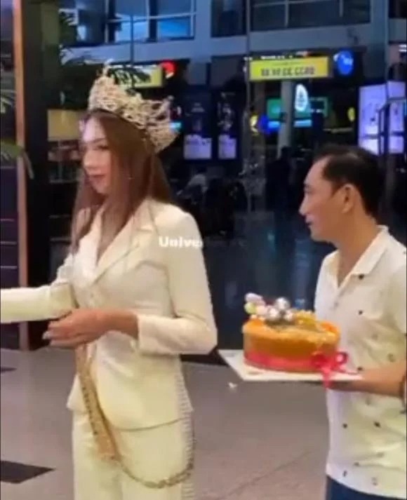 Ngay hôm sau, bố Thuỳ Tiên đã xuất hiện trong buổi chào đón con gái trở về. Mẹ của người đẹp cũng đến dự.