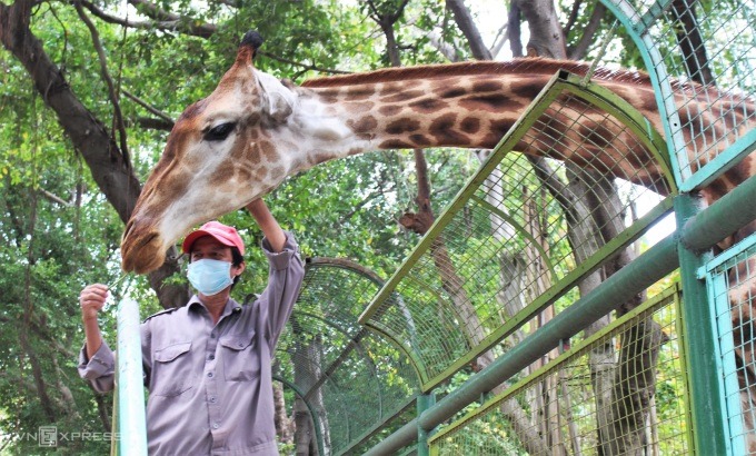 Một nhân viên đang chăm sóc hưu cao cổ tại Công viên Văn hóa Đầm Sen vào ngày đầu mở cửa trở lại 6/11/2021. Ảnh: Huỳnh Nhi