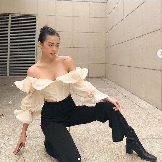 Trang phục tôn vòng 1, vòng 2 như áo croptop trễ vai được cô tận dụng triệt để.