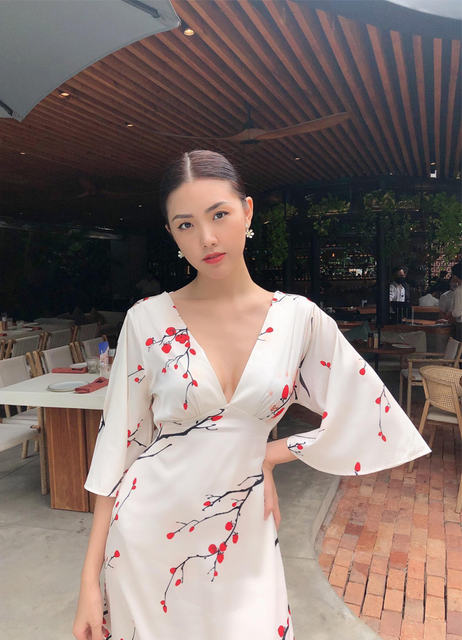 Ngoài ra, thi thoảng người đẹp còn những bộ đầm nữ tính, có họa tiết nhẹ nhàng.
