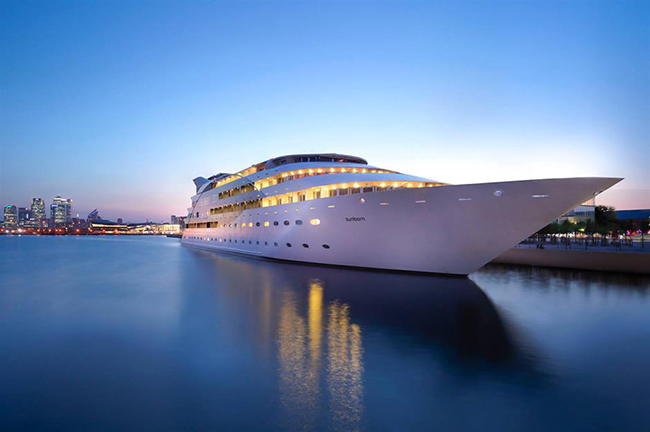 Sunborn, London, Anh: Nếu bạn không đủ giàu để sở hữu một siêu du thuyền, Sunborn là nơi dành cho bạn. Hãy tận hưởng toàn bộ trải nghiệm sang trọng trên du thuyền khách sạn nổi trên sông Thames ở khu vực Docklands này.