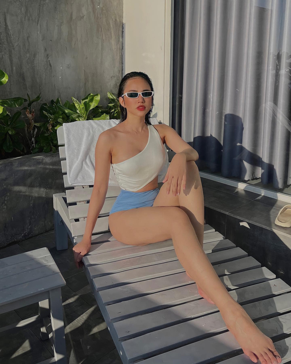 Cũng trong chuyến đi này, người đẹp tranh thủ “thả dáng” với bộ bikini màu pastel nhẹ nhàng.