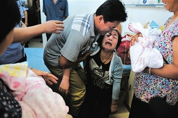 Tháng 8/2013, Vương Diễm Diễm cùng chồng khóc nức nở khi nhận lại hai bé gái song sinh từng bị Trương Thục Hiệp lừa bắt đi. Ảnh: Beijjing Times