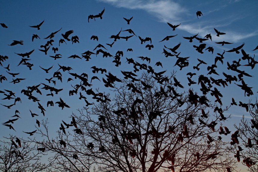 Quạ thường tập trung trong trung tâm thành phố vào khoảng hoàng hôn, sau khi chúng đã dành cả ngày để kiếm thức ăn.