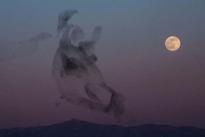 Khung cảnh đàn chim sáo đá bay lượn trên bầu trời khi Trăng tròn mọc ở Rome, Italy. Ảnh: Alessandra Benedetti / Corbis / Getty Images.