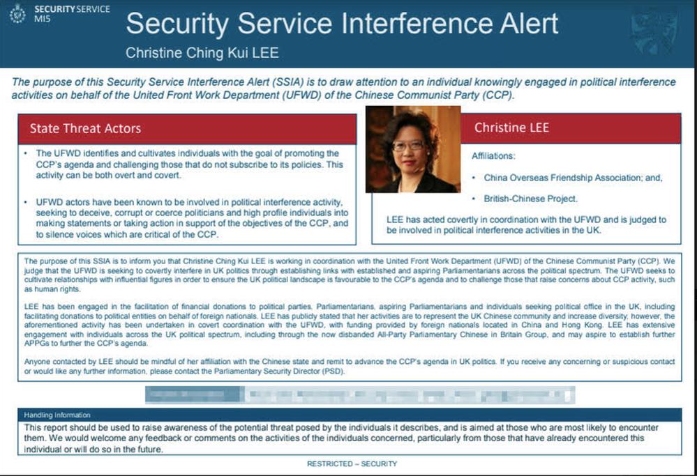 Theo cảnh báo gửi đến Cung điện Westminster, Cơ quan an ninh Anh (MI5) cáo buộc Christine Lee, luật sư làm việc ở London, "cố tình can thiệp hoạt động chính trị" tại Anh.