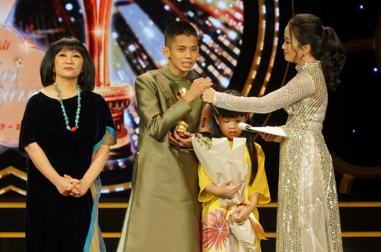 Hai người con nuôi của cố ca sĩ Phi Nhung là bé Đức Hiếu - Phi Như đại diện gia đình lên nhận giải thưởng (Ảnh: BTC).