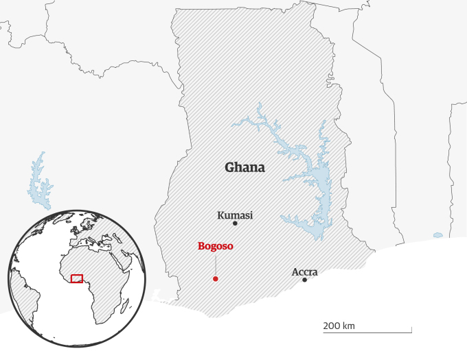 Vị trí thành phố Bogoso gần nơi xảy ra vụ nổ. Đồ họa: Guardian.
