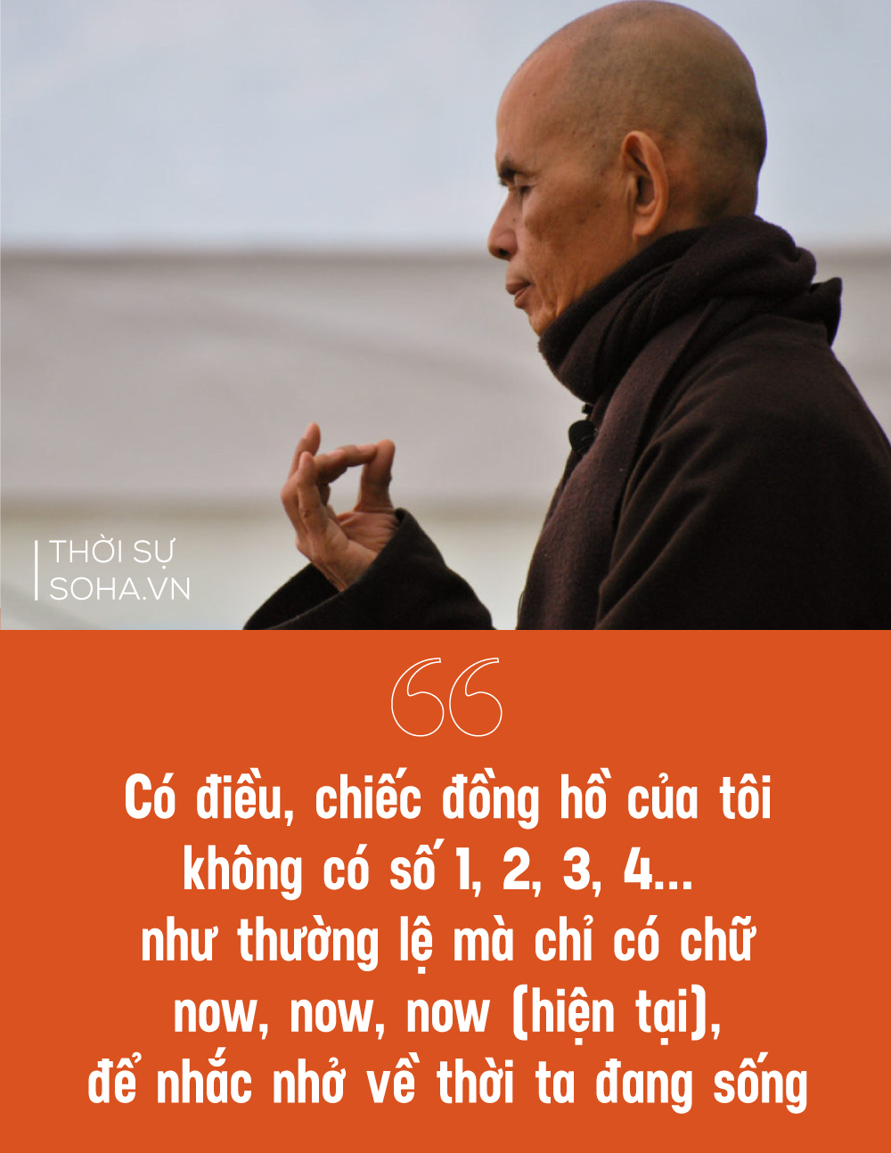 "Làm thế nào để tránh được stress, bị công việc thúc đẩy đúng hẹn?" - Ngài Jim Yong Kim hỏi thiền sư Thích Nhất Hạnh. Thầy bảo: "Hạnh phúc là tại tâm. Đỉnh cao là ước vọng khó mang tính định lượng. Người ta chỉ có thể chọn một trong hai: hoặc hạnh phúc hoặc là số 1. Hôm qua là quá khứ, không thể kéo lại được, ngày mai là tương lai chưa chắc chắn. V́ thế cuộc sống hiện tại mới quan trọng. Tôi có sở hữu một chiếc đồng hồ. Có điều, chiếc đồng hồ của tôi không có số 1, 2, 3, 4... như thường lệ mà chỉ có chữ now, now, now (hiện tại), để nhắc nhở về thời ta đang sống".