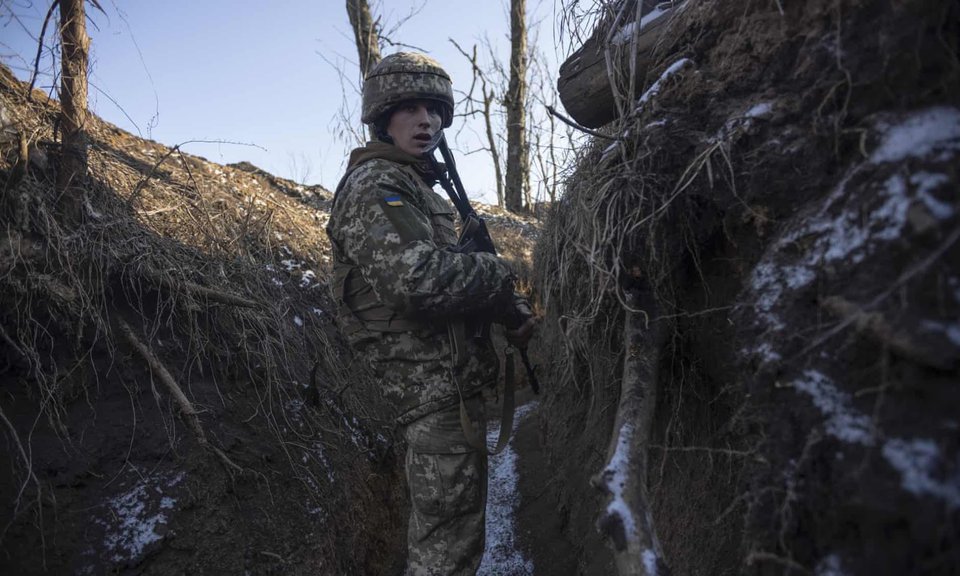 Một người lính Ukraine đứng ở chiến hào trên ranh giới ngăn cách phiến quân Nga ở Mariupol. Ảnh: AP.