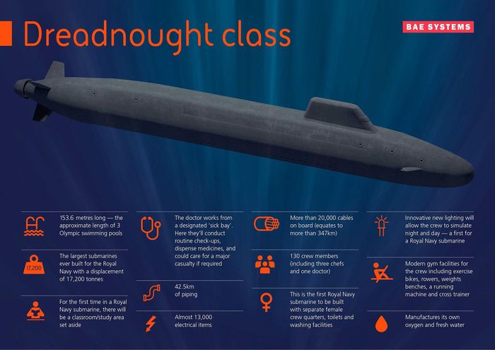 Chiếc HMS Dreadnought đang được BAE Systems chế tạo tại nhà máy đóng tàu Barrow-in-Furness ở Cumbria. Lớp Dreadnought sẽ lớn hơn lớp cũ, chủ yếu để tích hợp một số tính năng tàng hình mới. Chúng cũng sẽ dài hơn 3 mét so với lớp tàu tiền nhiệm, mặc dù có ít ống phóng tên lửa hơn.