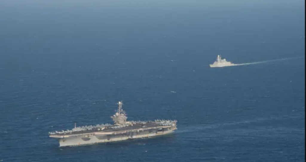 Tàu USS Harry S. Truman phía trước và tàu khu trục Ý ITS Andrea Doria di chuyển theo đội hình ở Địa Trung Hải hôm 17.1