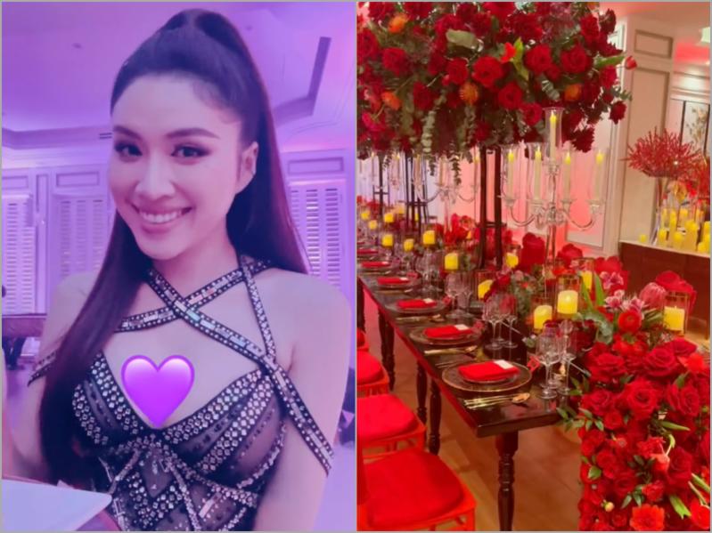 Trên kênh TikTok của mình, MC Thanh Thanh Huyền đã hé lộ một vài diễn biến trong đêm tiệc của giới siêu giàu mà cô dẫn chương trình. Được biết, chủ nhân buổi party này là các chủ tập đoàn lớn. Buổi tiệc được trang trí với tông đỏ và 15 nghìn cành hoa được nhập từ Châu Âu.