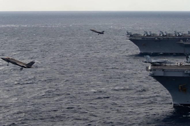 Tiêm kích F-35C cất cánh từ hai tàu sân bay Mỹ ở Biển Đông.