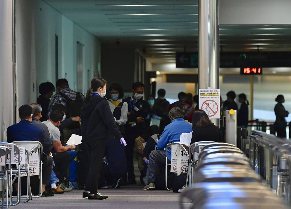 Những người nước ngoài chờ để được xét nghiệm Covid-19 tại Sân bay Narita (Nhật Bản) vào tháng 12/2021. Ảnh: The Japan Times.