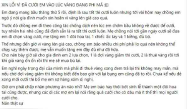 Bà hứa tặng em 1 đôi hoa tai, 1 chiếc lắc tay và 1 kiềng sao cho đủ bộ. Thế nhưng bây giờ vàng lên giá cao ngất ngưởng, chồng em bảo nhiều chi phí phải lo quá nên không thể chạy vạy thêm được trong khi mẹ chồng vẫn muốn tặng đầy đủ như đã hứa".