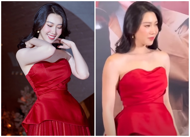 Một diễn viên nữ cũng xuất hiện tại buổi họp báo phim chúc mừng đàn chị Thu Trang là Thúy Ngân. Diện đầm cup ngực màu đỏ, diễn viên sinh năm 1991 khoe nhan sắc rạng rỡ trước ống kính. So với ảnh chụp từ clip quay bằng camera thường, ngoại hình Thúy Ngân không có sự thay đổi.