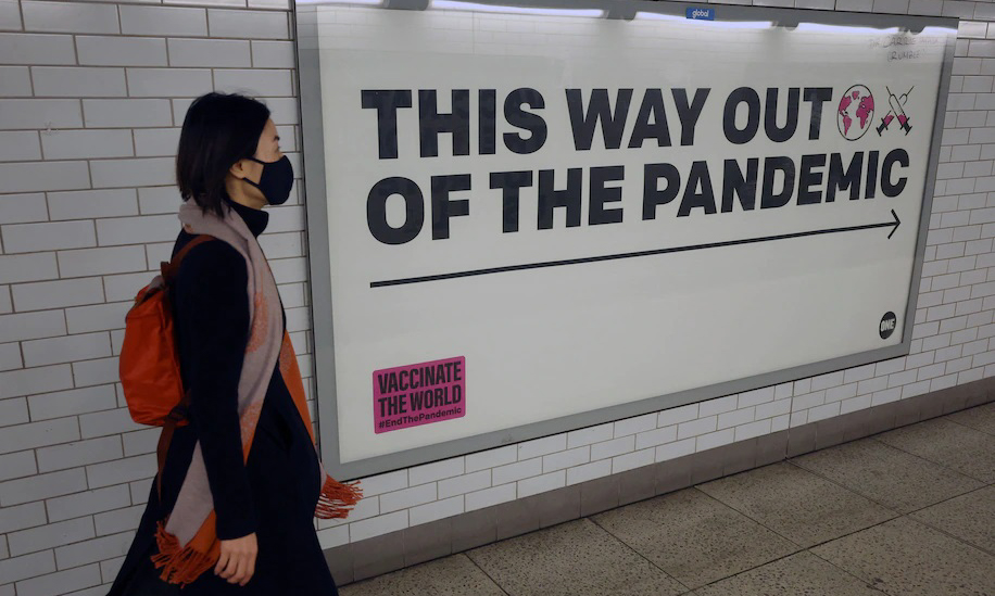 Một người phụ nữ đeo khẩu trang đi qua biển khuyến khích tiêm chủng ở thủ đô London, Anh. Ảnh: Reuters.